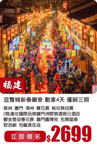 春節加班【純玩年味福建】泉州 廈門 漳州 雙城新春廟會 賞花展 2晚連住國際品牌 無自費 動車4天