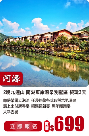 純玩 升級回歸連住兩晚九連山南湖東岸溫泉別墅區(每間房都有獨立泡池)任浸各式珍稀溫泉3天