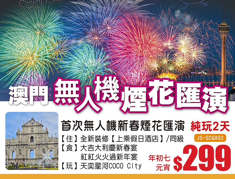新春大吉 澳門首次無人機新春煙花匯演,一家大細齊來睇!享視覺震撼,得歡樂心情!純玩2天 $299