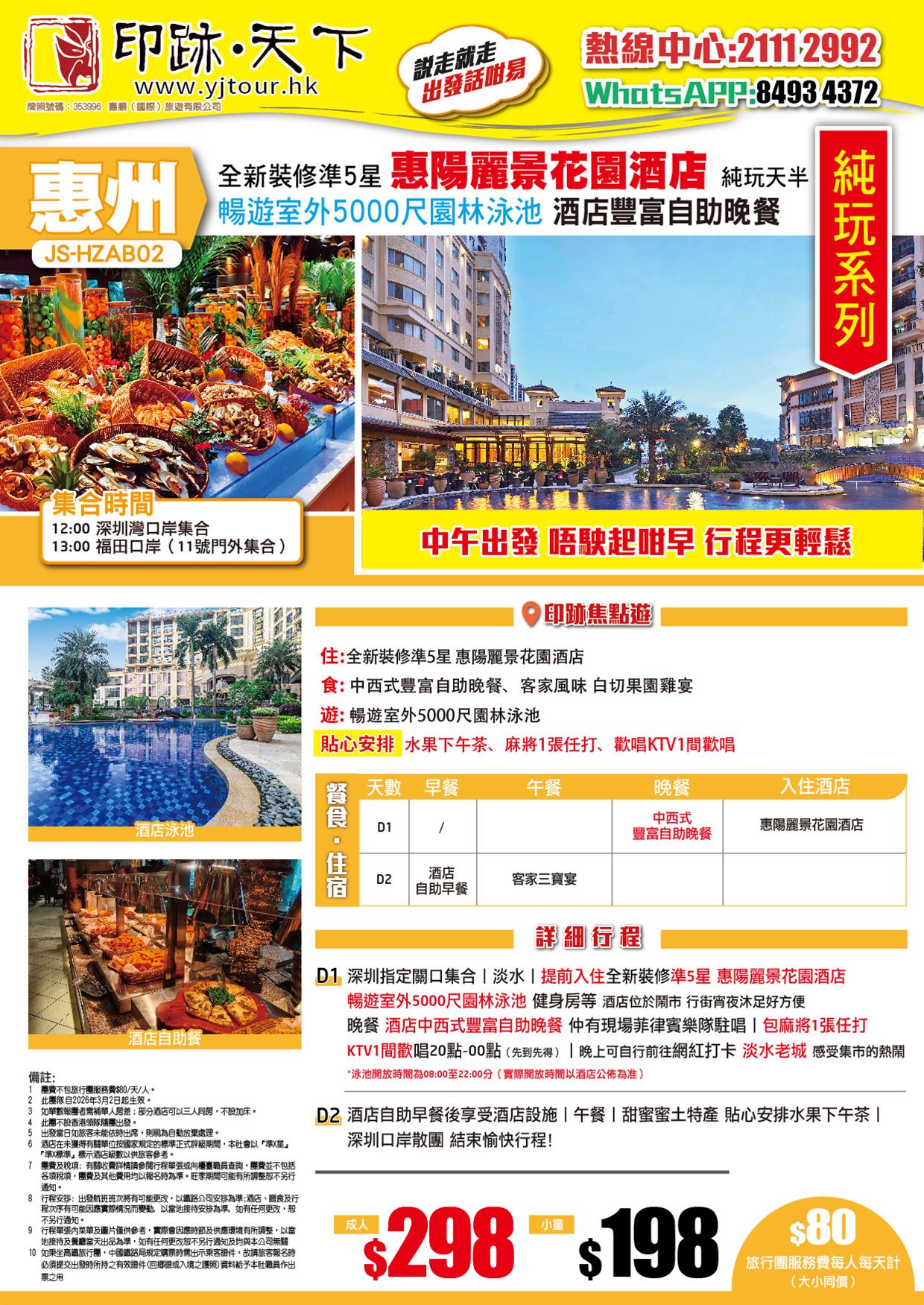 | 03月28日 | 星期六 | $298 | $198 |