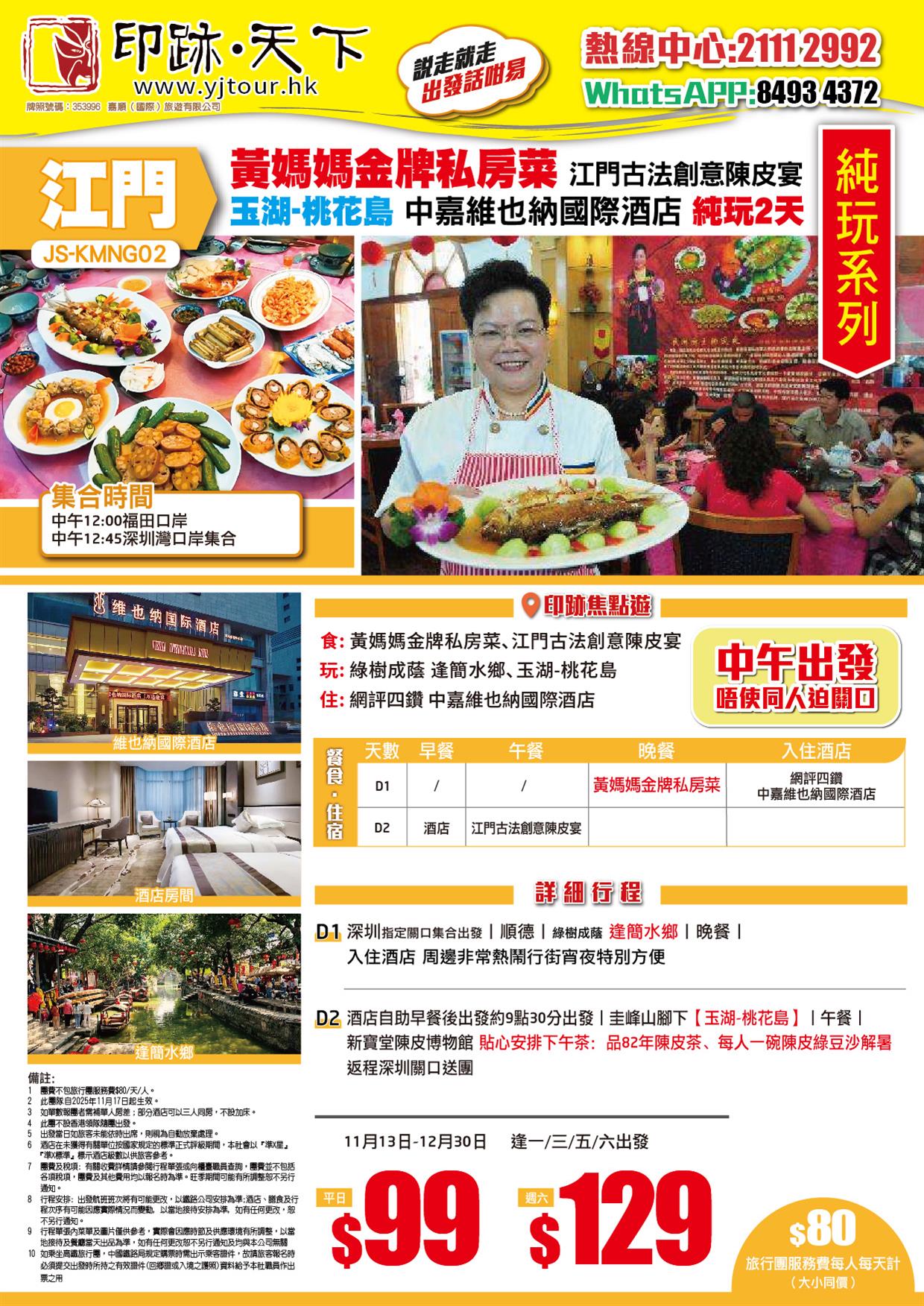 江門黃媽媽金牌私房菜+江門古法創意陳皮宴 遊【玉湖-桃花島】 網評四鑽【中嘉維也納國際酒店】純玩2天