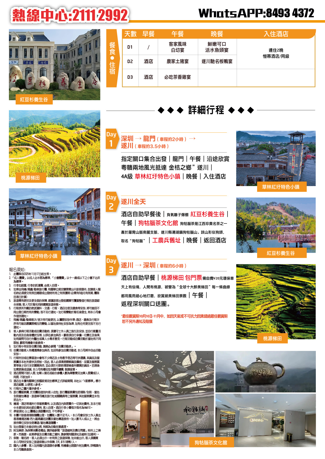 D3、遂川-深圳(約6小時) 酒店自助早餐後出發→包門票/環保車【桃源梯田】(天上有仙境,人間有桃源,被譽為“全球十大醉美梯田”每一條曲線都用風雨細心地打磨,欣賞絕美梯田景觀)→午餐→返程深圳關口送團。 (最佳觀賞期10月10日-11月中,如因天氣或不可抗力因素錯過最佳觀賞期,恕不另外通知及賠償)