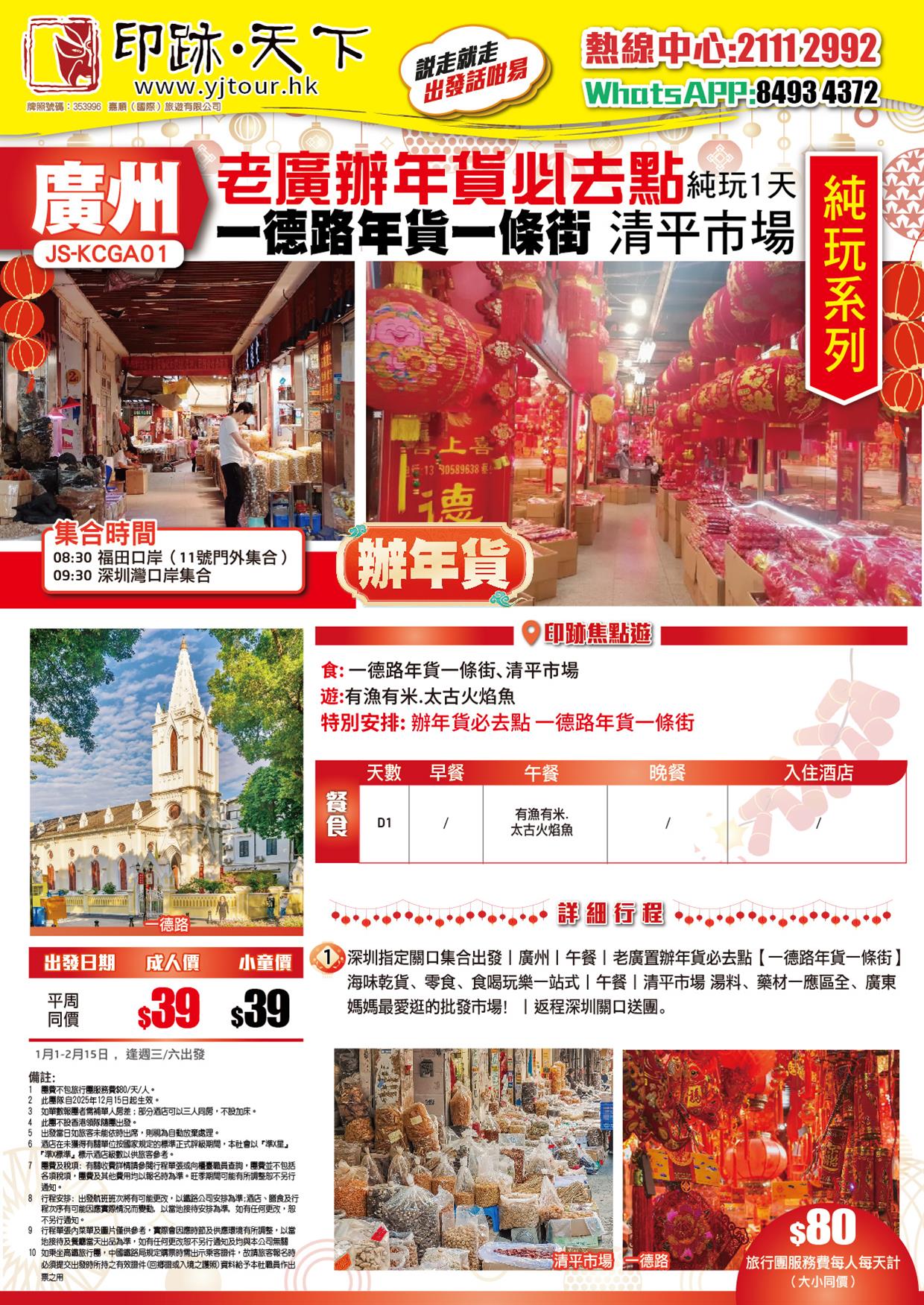 D1、深圳指定關口集合出發→前往廣州→午餐→老廣置辦年貨必去點【一德路年貨一條街】(海味乾貨、零食、食喝玩樂一站式)午餐→【清平市場】(湯料、藥材一應區全、廣東媽媽最愛逛的批發市場!)→返程深圳關口送團。