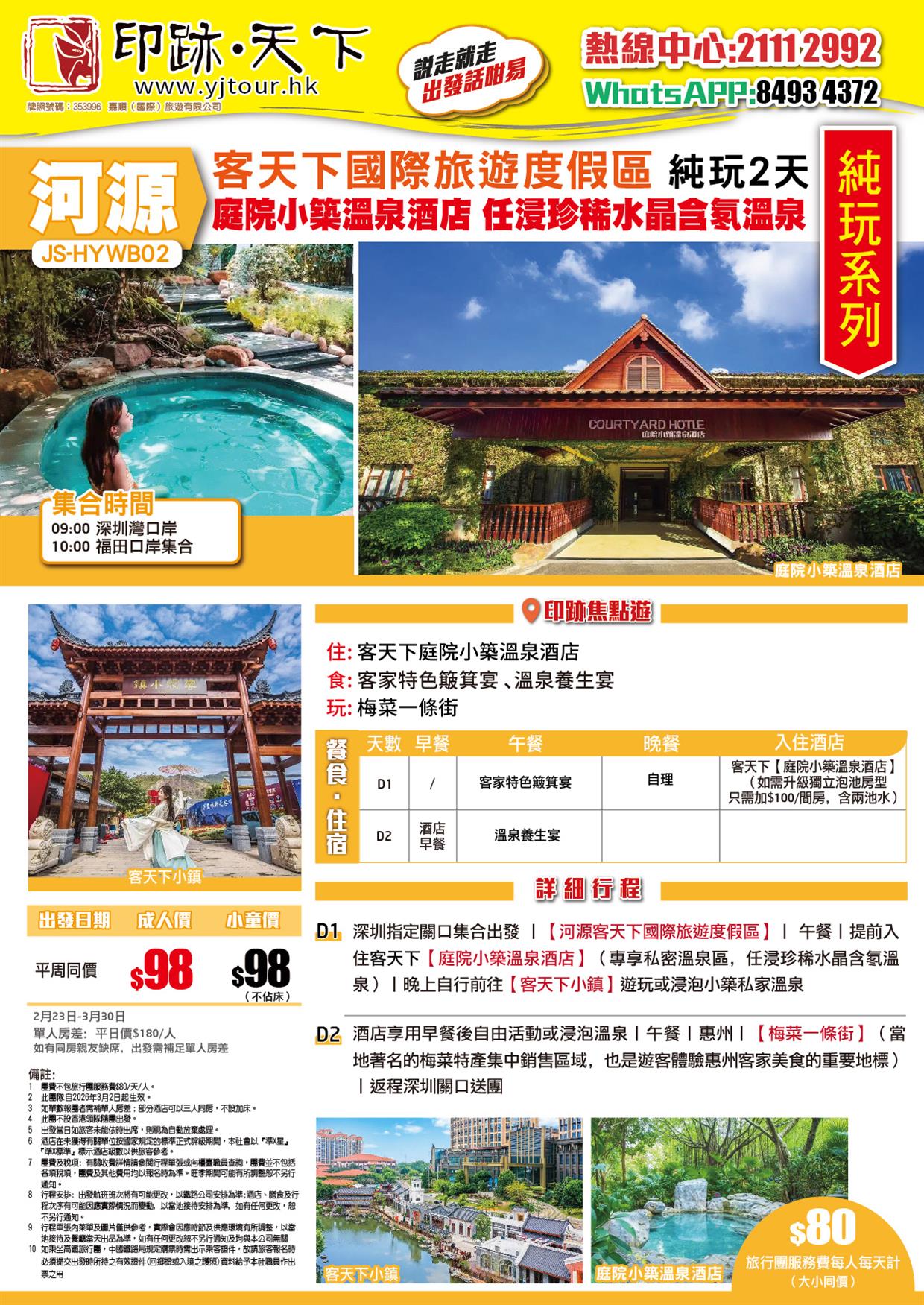 D1、深圳指定關口集合出發→【河源客天下國際旅遊度假區】→午餐→提前入住客天下【庭院小築溫泉酒店】(專享私密溫泉區,任浸珍稀水晶含氡溫泉)→晚上自行前往客天下小鎮遊玩或浸泡小築私家溫泉