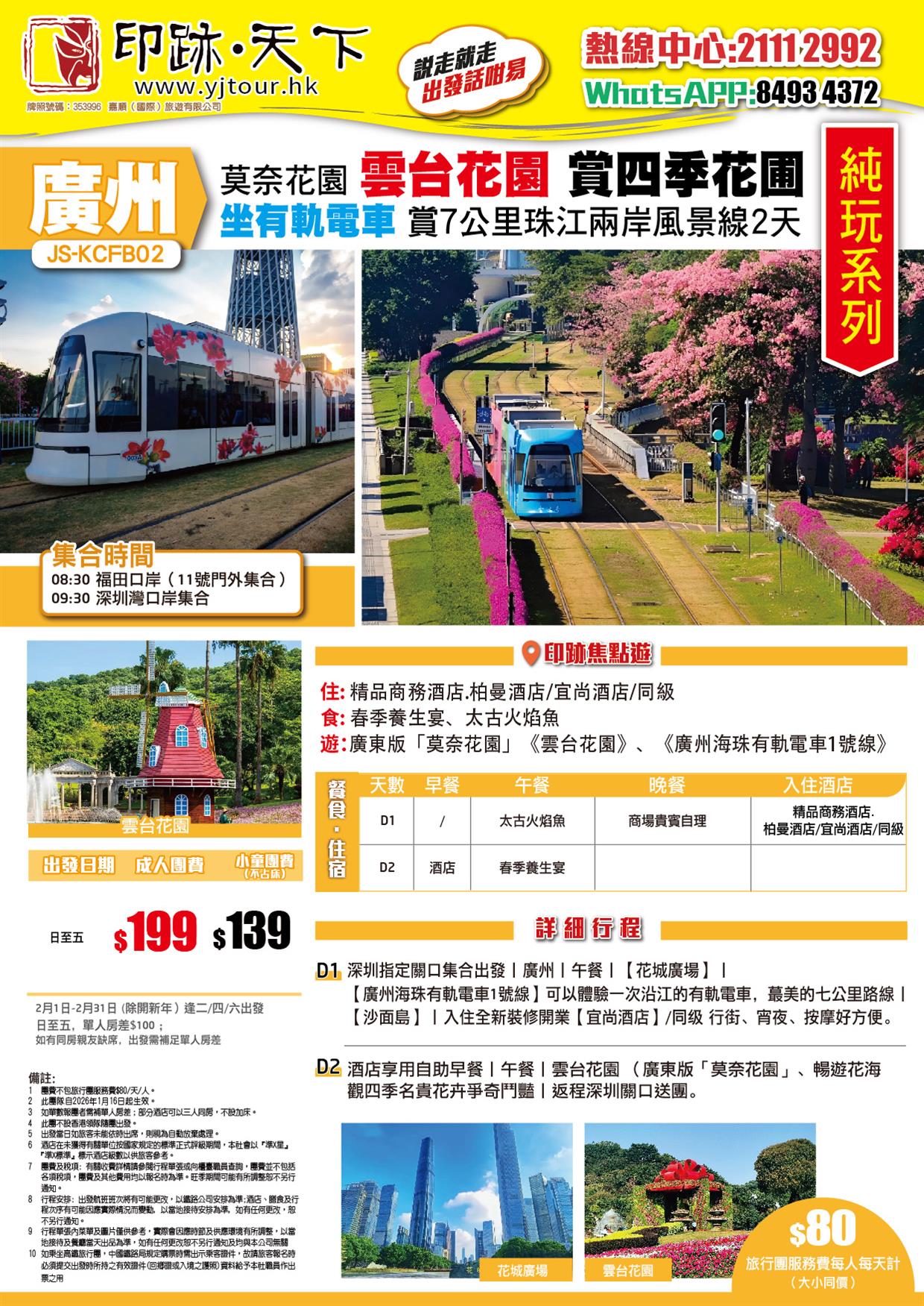 D1、深圳指定關口集合出發→前往廣州→午餐→【花城廣場】→【廣州海珠有軌電車1號線】(可以體驗一次沿江的有軌電車,蕞美的七公里路線)→【沙面島】→入住全新裝修開業【宜尚酒店】/同級 行街、宵夜、按摩好方便。