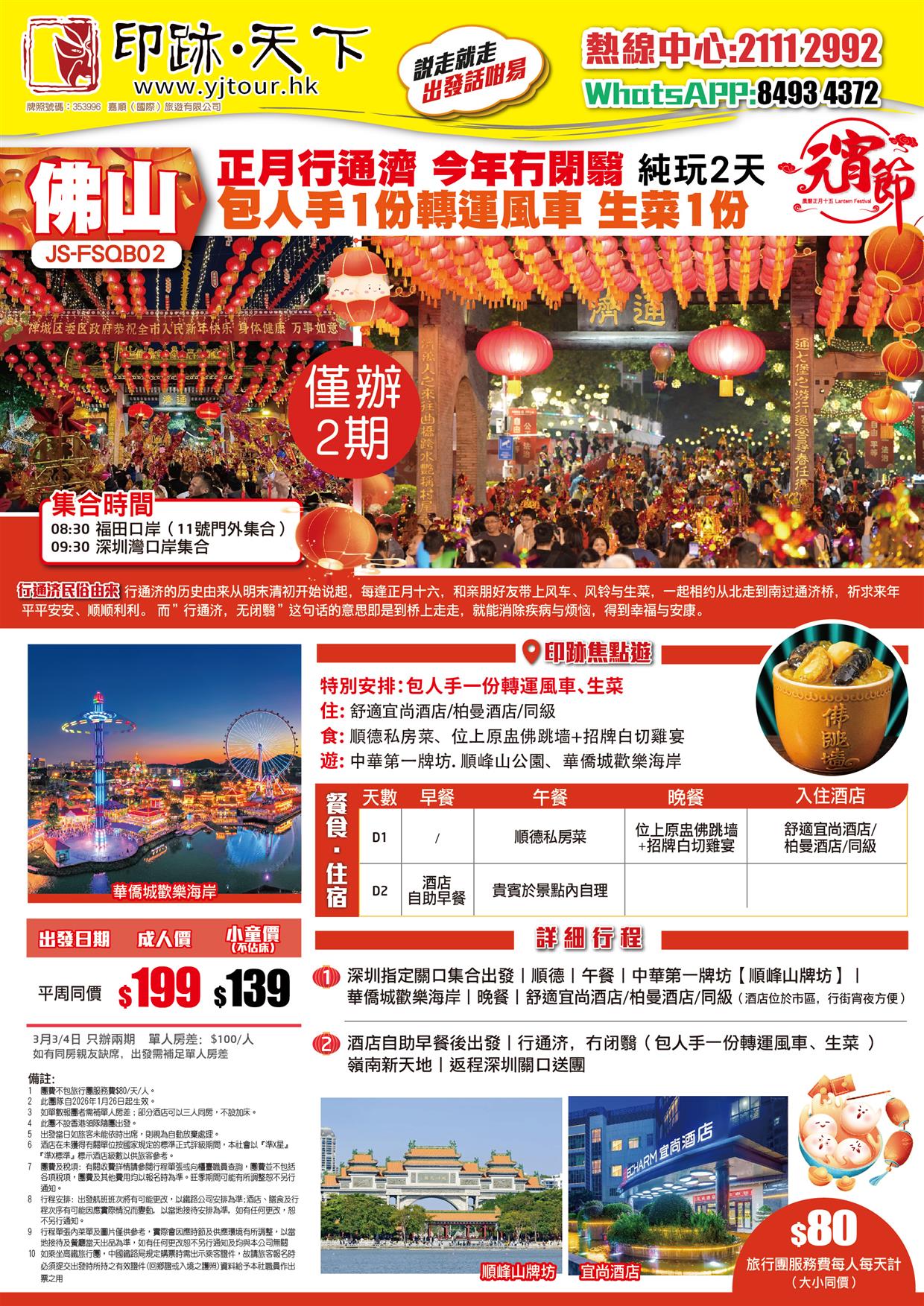 佛山 正月行通濟 今年冇閉翳 包人手一份轉運風車、生菜一份 入住舒適宜尚酒店 純玩2天
