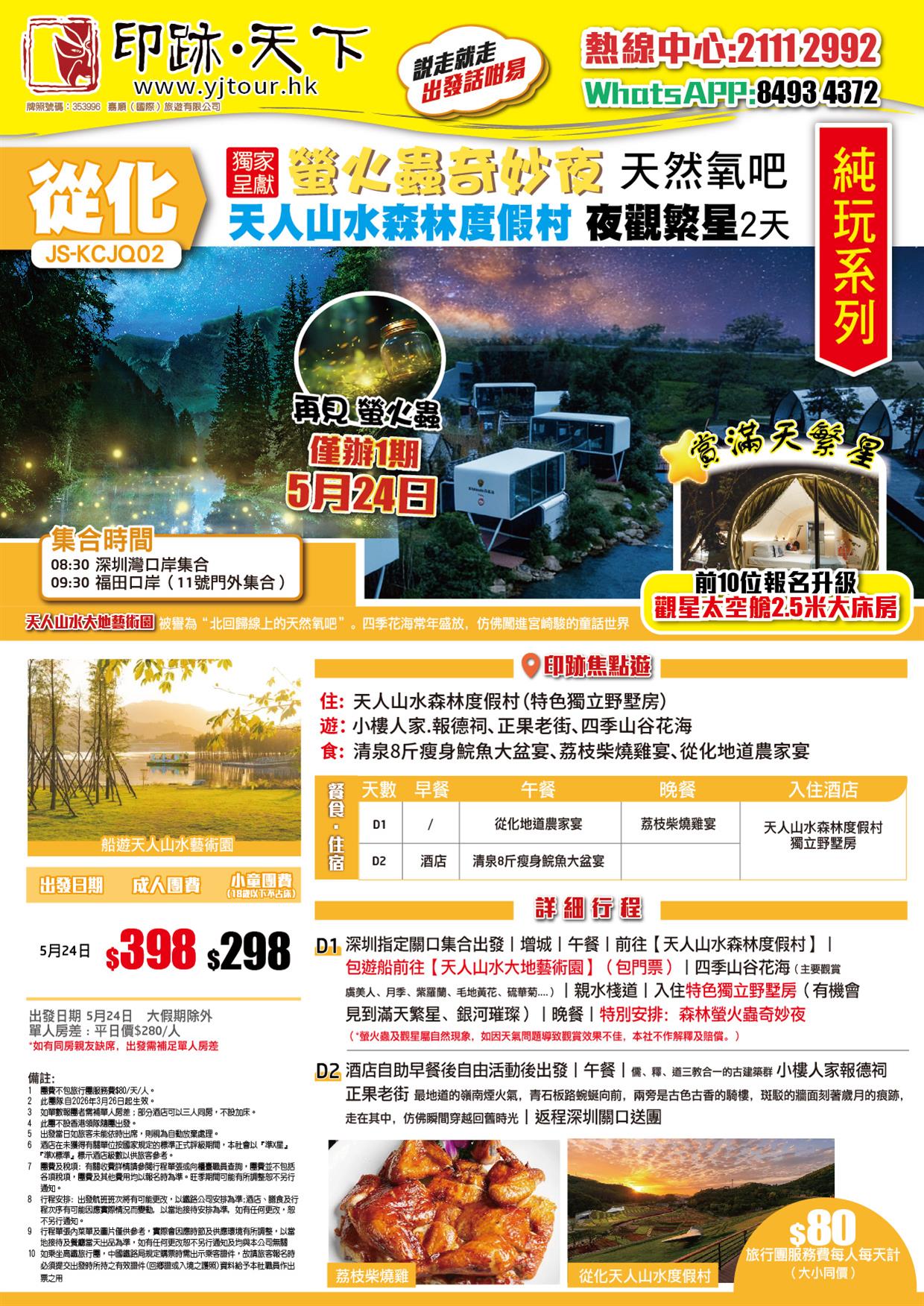 從化 獨家呈獻 螢火蟲奇妙夜 天人山水森林度假村 夜觀繁星純玩2天